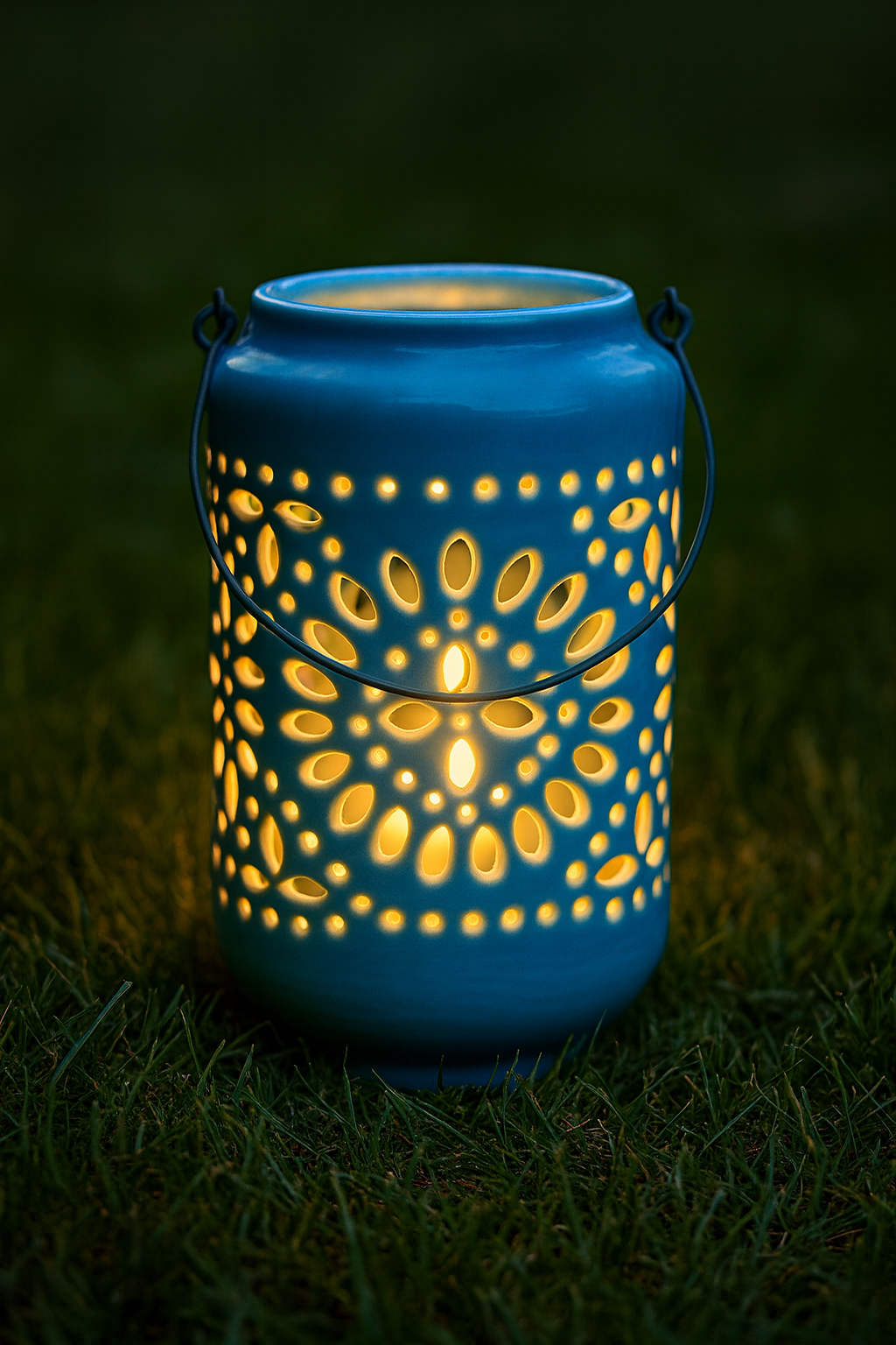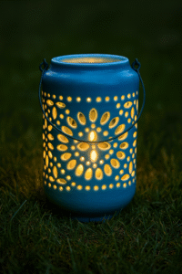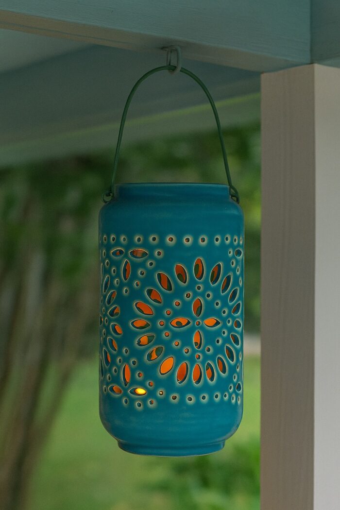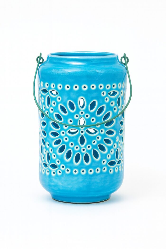 This Blue and Green Geometric Flower Lantern adds a cozy glow to gardens, patios, and conservatories during the summer months. Handcrafted in India, its glazed enamel exterior is intricately cut with tiny geometric flower patterns, allowing candlelight to flicker beautifully through. A metal handle makes it easy to carry and move around.