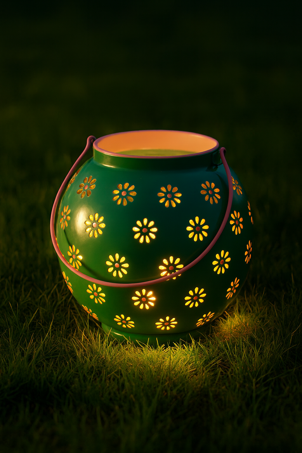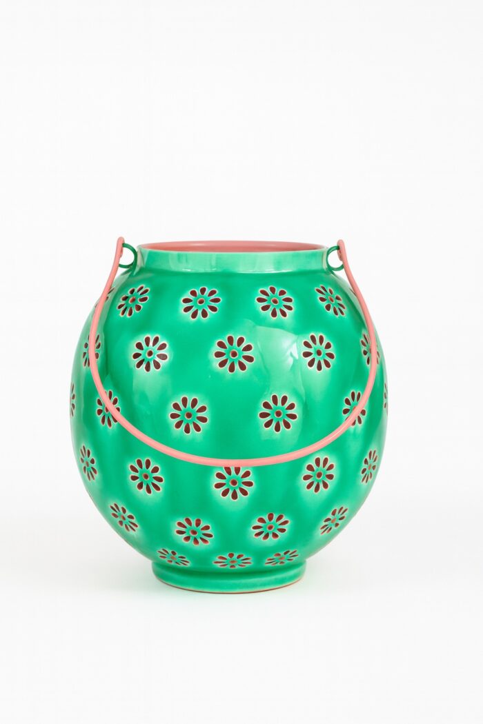 This Green and Pink Geometric Flower Lantern adds a cozy glow to gardens, patios, and conservatories during the summer months. Handcrafted in India, its glazed enamel exterior is intricately cut with tiny geometric flower patterns, allowing candlelight to flicker beautifully through. A metal handle makes it easy to carry and move around.