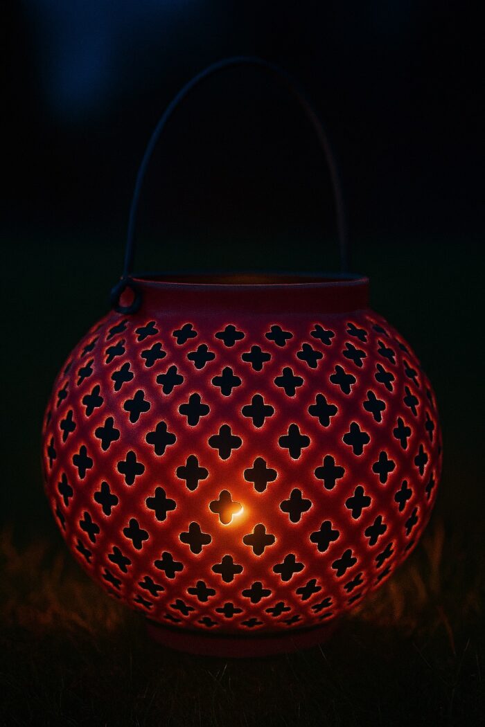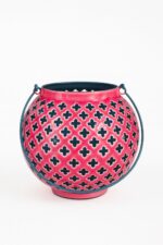 This Pink and Blue Geometric Flower Lantern adds a cozy glow to gardens, patios, and conservatories during the summer months. Handcrafted in India, its glazed enamel exterior is intricately cut with tiny geometric flower patterns, allowing candlelight to flicker beautifully through. A metal handle makes it easy to carry and move around.