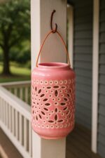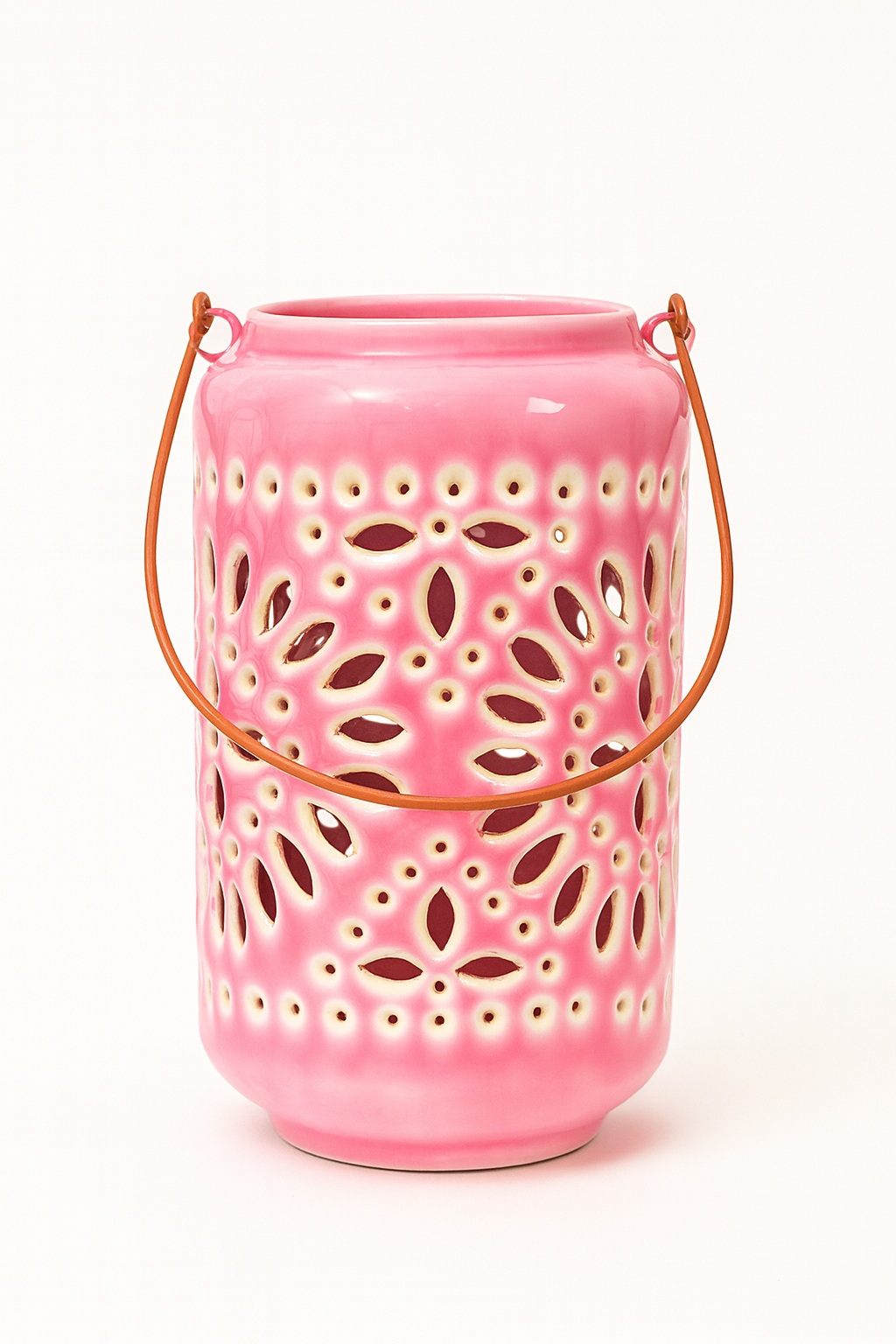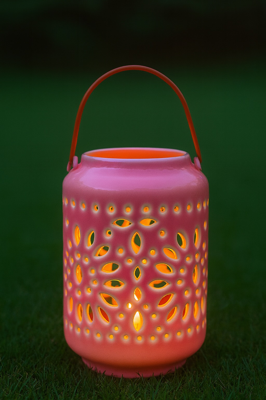 This Pink and Orange Geometric Flower Lantern adds a cozy glow to gardens, patios, and conservatories during the summer months. Handcrafted in India, its glazed enamel exterior is intricately cut with tiny geometric flower patterns, allowing candlelight to flicker beautifully through. A metal handle makes it easy to carry and move around.