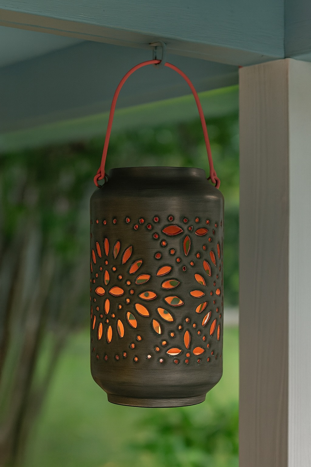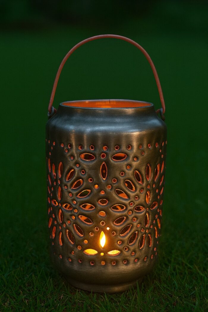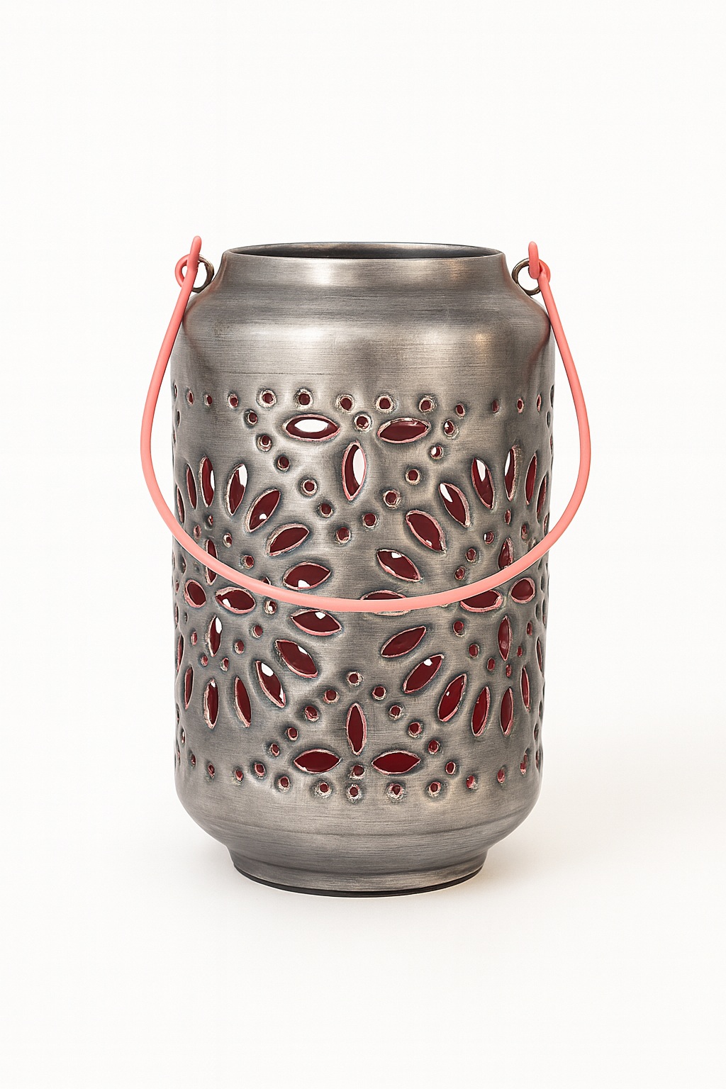 This Silver and Pink Geometric Flower Lantern adds a cozy glow to gardens, patios, and conservatories during the summer months. Handcrafted in India, its glazed enamel exterior is intricately cut with tiny geometric flower patterns, allowing candlelight to flicker beautifully through. A metal handle makes it easy to carry and move around.