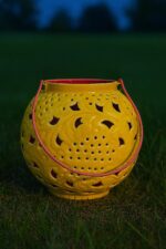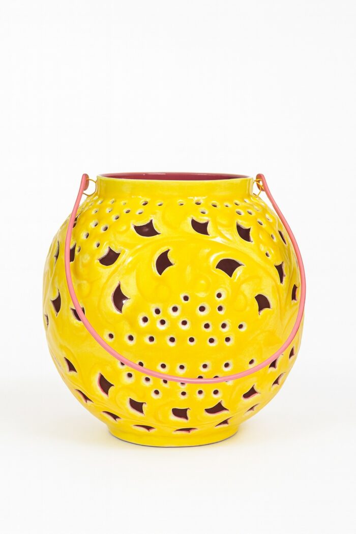 This Yellow and Pink Geometric Flower Lantern adds a cozy glow to gardens, patios, and conservatories during the summer months. Handcrafted in India, its glazed enamel exterior is intricately cut with tiny geometric flower patterns, allowing candlelight to flicker beautifully through. A metal handle makes it easy to carry and move around.
